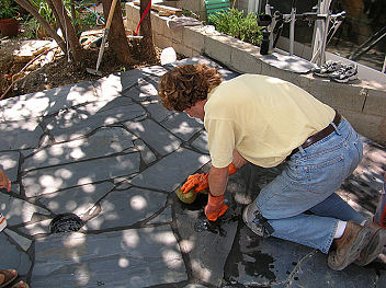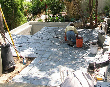 This project included a custom built L-shaped pond by Christian Amoros whose surface would be level with a newly created slate tile patio. Seven terraced slate steps ranging in width from 5 ft to 10 ft were constucted and installed. |